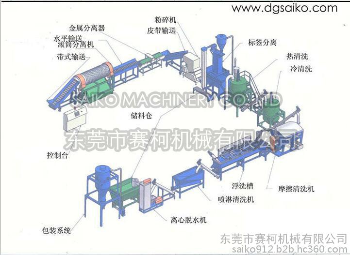 本套設備主要由:輸送帶,破碎機(粉碎機),磨擦清洗機,沉淀漂洗槽,鏈料挖料機,塑料擠干脫水機,控制柜等組成。對廢舊塑料進行分選(分揀),破碎(帶水粉碎),摩擦清洗,漂洗,擠干脫水等回收再生處理,整條生產線從開始廢料到成品,操作非常高效的清洗廢塑料制品,廢臟農用薄膜,廢包裝材料。操作簡易,效率高,環保,節能。